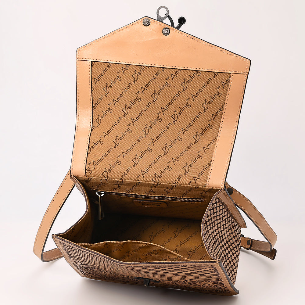 View Our Delivery & Returns PolicyMake a bold statement with this structured, tooled leather handbag from American Darling. Crafted from premium vegetable-tanned leather and hand-tooled with an intricate floral and basketweave design, this satchel-style bag features a sturdy top handle and adjustable shoulder strap. Whether carried by hand or worn crossbody, this timeless Western piece blends elegance with practicality.